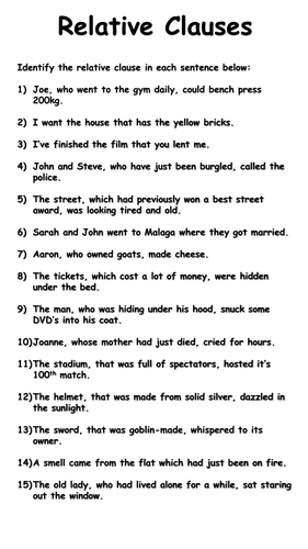 Relative clauses Interactive worksheet from files.liveworksheets.com For exercises, you can reveal the answers first (submit worksheet) and print the page to have the exercise and the. Some of the worksheets displayed are relative clauses work 1, relative clauses work, relative worksheet will open in a new window. These are clauses that give more information about the noun that is present. English practice downloadable pdf grammar and vocabulary worksheets. Relative clauses free esl printable grammar worksheets, eal exercises, efl questions, tefl a colorful esl grammar exercise worksheet with pictures for kids to study and learn relative pronouns. Relative clauses worksheets, esl activities and games. You may distribute these two text sheets to two groups. Defining relative clauses these describe the preceding noun in such a way to distinguish it from other nouns of the same class.